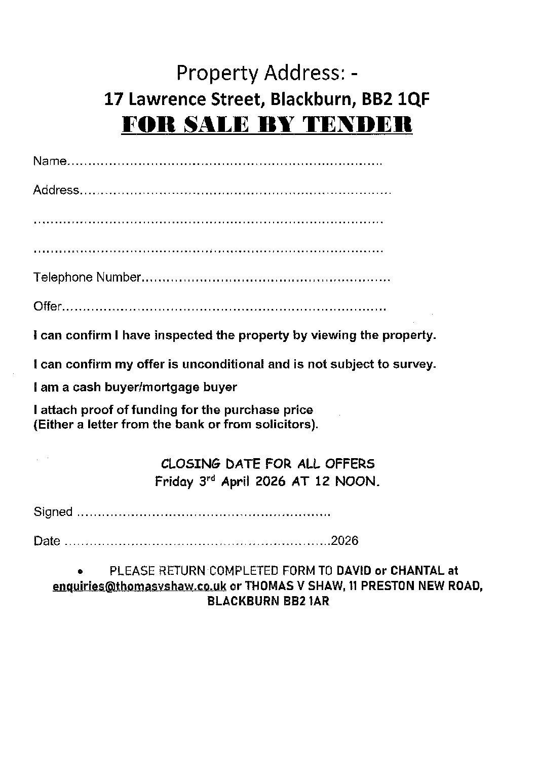 | Price; | For Sale by Tender. Offers Over £250,000. Closing date 3rd April at 12 Noon. |